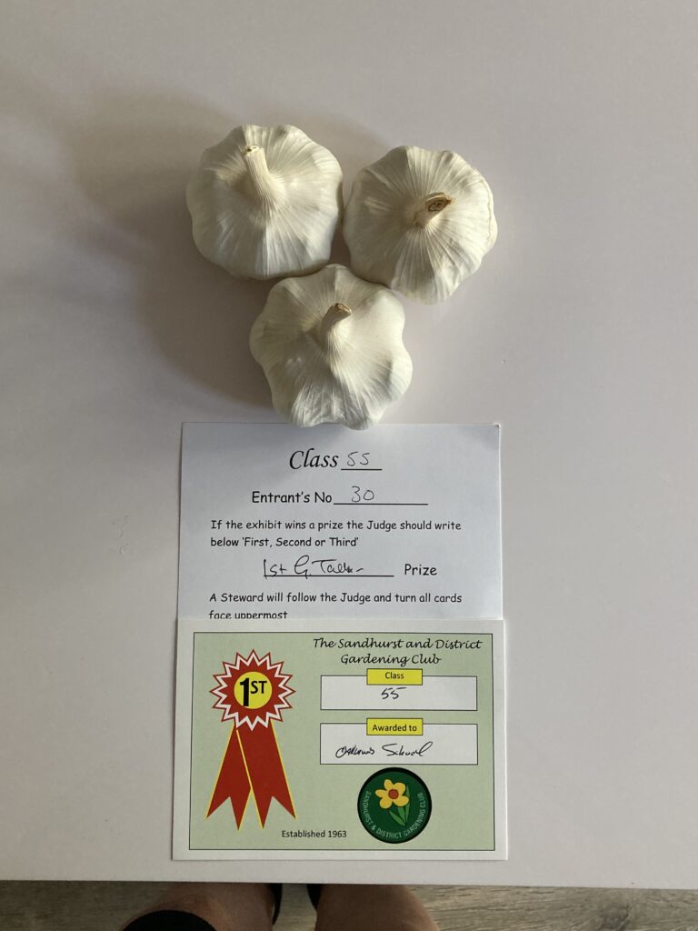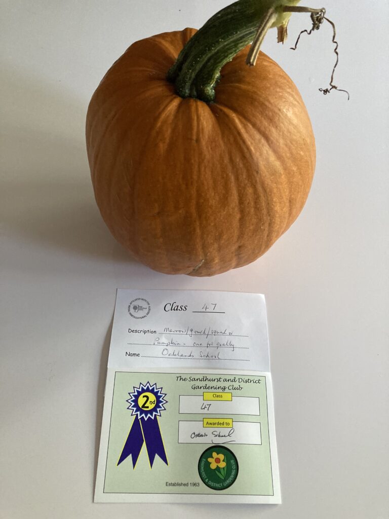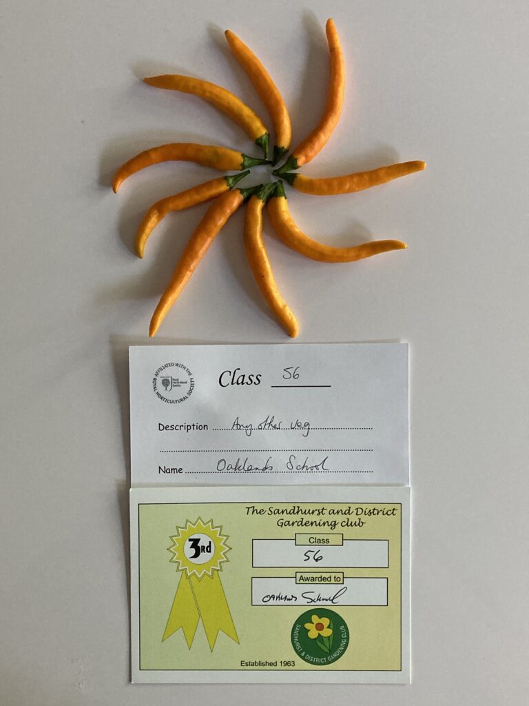 Sandhurst and District Gardening Club: Mr Hopley and his budding team of keen school gardeners entered a selection of fresh produce they had grown in the Sandhurst and District Gardening Club. We are delighted to announce that the Oaklands garlic took first place, pumpkin second and chillies third. Well done to all involved and a big thank you to Mr Hopley.