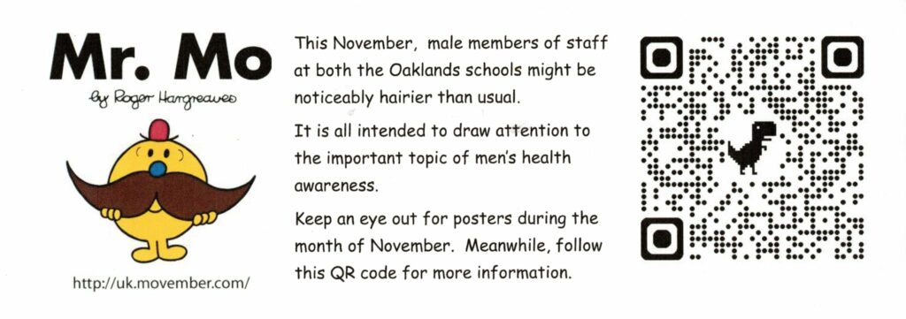 With half-term upon us, it won’t be long before we begin the long run towards Christmas, with events such as Decoration Day and the Year 3 play in December. Before then, we do have our annual fireworks spectacular on Saturday 8th November, which is a great night’s entertainment as well as being a fantastic fundraiser for the PTA. I hope many of you will be able to attend. I am quite sad I can’t be there this year but I will be at Murrayfield in Edinburgh cheering on Scotland as they take on the All Blacks. November also brings about Movember and, this year, we have six members of staff growing moustaches to raise awareness of men’s health. Try and spot which staff are taking part!