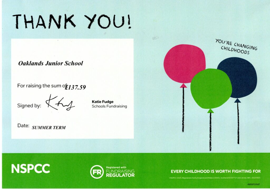 NSPCC Thank you: We have received the following thank you from the NSPCC for our fundraising efforts in the summer term. Thank you to everyone who supported this initiative.